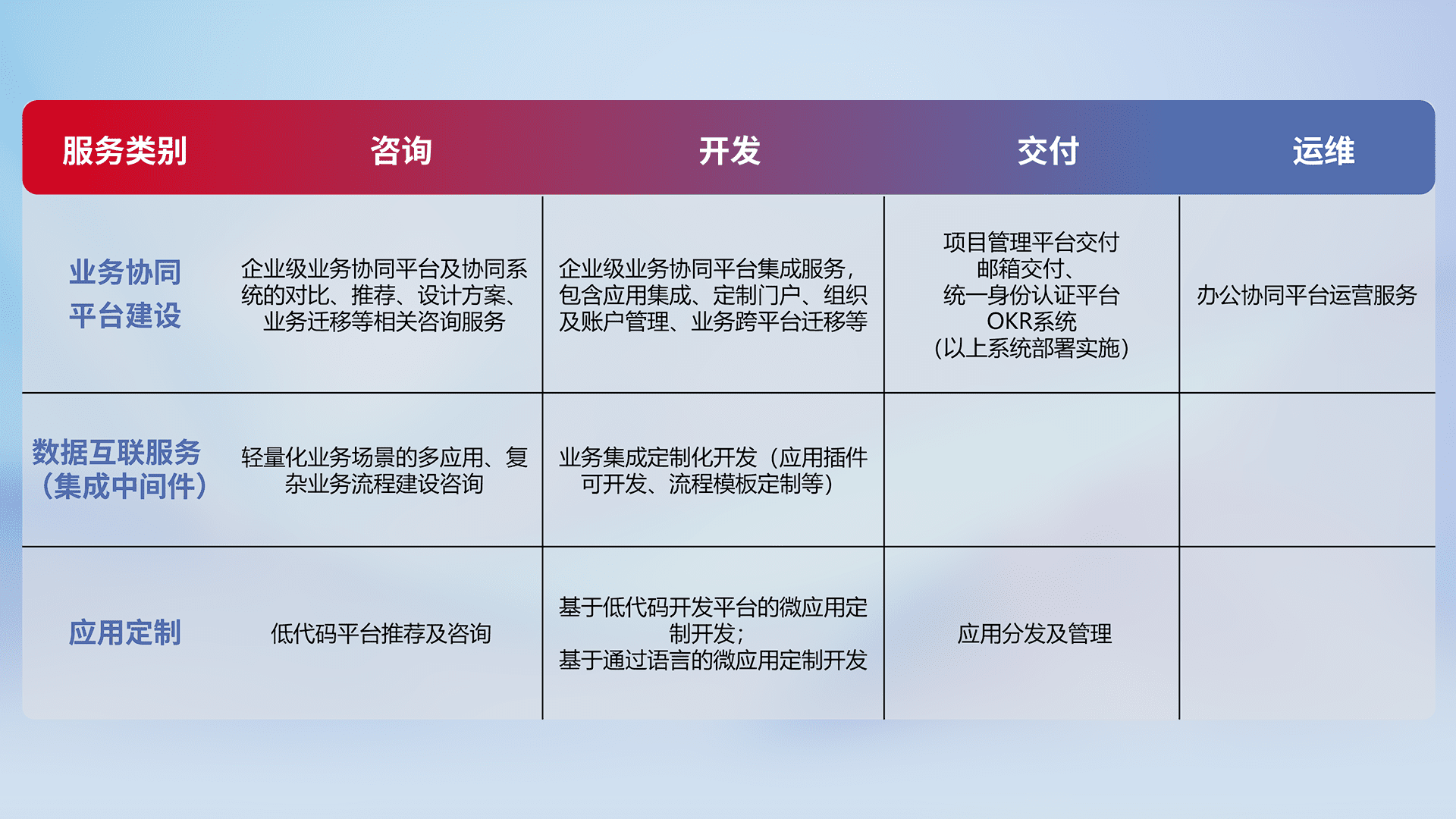针对钉钉、、企微、、、、IDaas等平台级产品提供产品的规划、、、方案、、、、交付、、、定制化开发等服务,,,,实现如统一协同办公、、、、智能客户服务、、、混合会议管理、、智能数据查询、、等业务场景,,,实现数字化转型。。